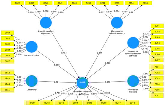 As the goal of SEM-PLS is to explain the endogenous latent variance, the key target is to have a higher R square. The greater the value, the better the explanatory power of the model [52]. The authors of [53] argued that a value of R square greater than 0.26 is considered substantial, as a rule of thumb. The results obtained in this present restudy show that the R square value for scientific research output was 0.684, which was acceptable. The corresponding results are presented in Figure 2.