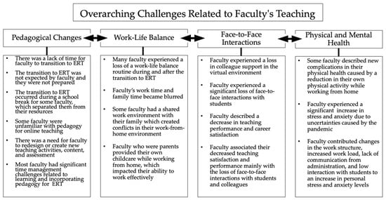 Key findings related to the themes of pedagogical changes, work–life balance, face-to-face interactions, and physical and mental health are summarized in Figure 1.