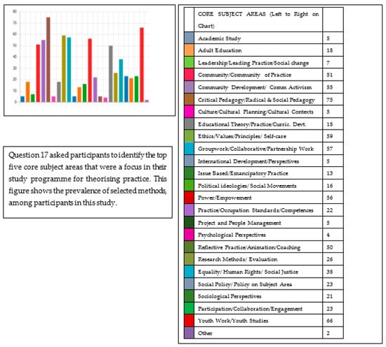 Figure 1 shows that the core selected subject area was ‘critical/radical pedagogy and social pedagogy’ (75 respondents). This was closely followed by youth work/youth studies (66), ethics/values/self-care (59), groupwork/collaborative and partnership working (57), power and empowerment (56) and community development/activism (55).