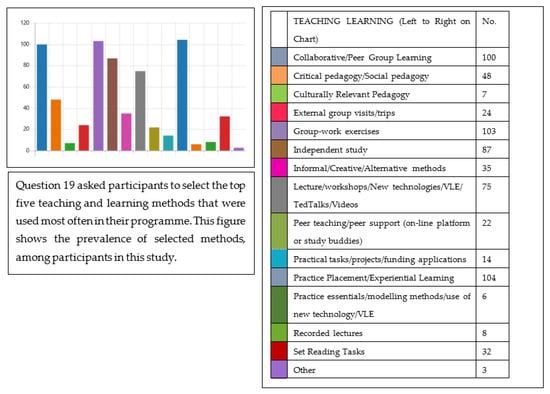 Above, Figure 2, shows the response from participants regarding teaching and learning methods on the programmes they attended. These were interesting, in that it came as no surprise that the top three picks were practice/placement (104), group work exercises (103) and collaborative/peer group learning (100). These were fairly typical expectations for a practice-based programme, which showed that the programmes the research participants engaged with offered a pedagogically sound learning experience, indicative of the field of practice. Exposing students of CYW programmes to community-based work in practice seem obvious as a teaching method in this field, where Jakubowski and Burman [] stated that ‘[t]here are many reasons pedagogically for bringing classroom and community together’ (p. 165), where students have an opportunity to develop ongoing relationships with community members over time.