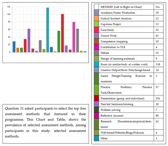 The findings in Figure 3, show that essay (118 respondents), presentation (101) and reflective accounts (80) were selected as most prevalent, followed by research dissertation (62), course work (62), and practice portfolio (57), which included practice-based tasks and practice observation. The middle-ground assessment methods comprised case study (35), debate (32), academic posters (29), and peer-led seminars (18). Finally, the less frequently selected assessment methods included creative output (14), which included short film- and image-based methods, a capstone project (12) and critical incident analysis (12), game design/training exercises (9), designing learning materials (9), problem solving (7), contribution to the VLE (4), and web-based assessment (4), which included website development/blogs and podcasts.