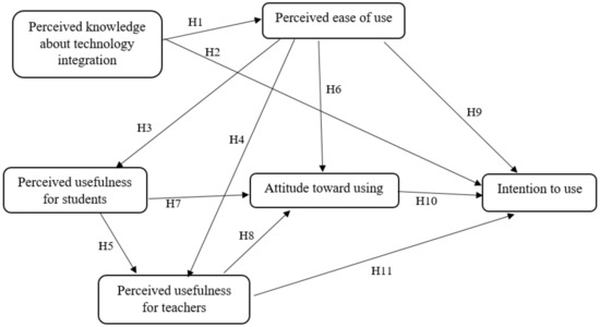 Among preservice teachers, studies have assessed the effect of professional knowledge on intention solely to use (e.g., [14]) and how beliefs affect intention to use (e.g., [33]). A few studies [6,28,29] estimated a model that included three dimensions: knowledge, beliefs, and attitudes. The present study focused on perceived knowledge about technology integration and on beliefs about using technology (perceived ease of use and perceived usefulness) from the TAM model, attitude toward using technology in education, and intention to use technology in education. Going beyond the previous studies, we also separately analysed perceived usefulness for students and perceived usefulness for teachers. According to the hypothesized model (Figure 1), we formulated four research questions and eleven hypotheses.