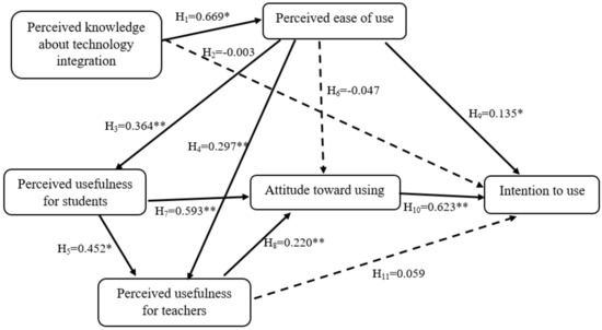 Earlier studies have found different results about the relationships between beliefs, attitudes, and the intention to use technology in teaching. In the case of student teachers in Singapore and Malaysia, perceived usefulness of technology, ease of use, and attitude toward computer use were found to be key determinants of behavioural intention toward technology use [32]. More specifically, some studies have found that intention to use is directly affected by perceived usefulness [31,33,36] and attitude toward use [31,33]. In contrast, it has been found that attitude does not affect intention to use [36]. Furthermore, the role of perceived ease of use is not clear. In some studies, perceived ease of use had an indirect impact on intention to use via perceived usefulness [31,36] and attitudes [31]. However, the results of another study [36] indicate that perceived ease of use did not affect attitude toward use. In addition, it was found in [31,33] that attitudes influenced intention to use, but such an effect was not found in [36].