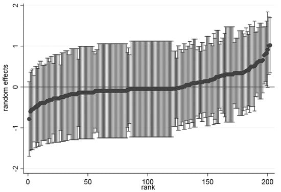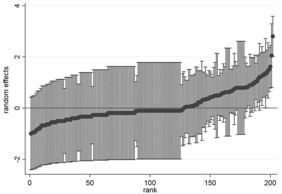 A Likelihood-Ratio Test (MB1: χ2(1) = 10.40 p = 0.0000) confirmed that a multilevel model fits the data better than a simple logistic regression model. The relevance of interclass correlation (ICC) is also displayed in the ICC values in Table 2. The plot (Figure 2) shows the estimated residuals for the districts in the sample. Here, too, for a small number of districts, the 95% confidence interval does not overlap the horizontal line at zero, indicating that the uptake of NCE in courses in these districts is significantly above the mean log-odds of participating. A closer look into these districts demonstrates that they score remarkably higher on average GDP (7.2 vs. 6.2) and have a smaller dept per capita (2.1 vs. 2.5). Depending on the district, individuals’ probabilities of participation in NCE courses range between exp(−3.1)/[1 + exp(−3.1)] = 0.04 to exp(0.73)/[1 + exp(0.73)] = 0.68 with the confidence intervals in very central and very peripheral districts. The data also show that especially in districts with a rather small GDP, confidence intervals decrease to the lower end when the debt is increasing. These figures already indicate that financial resources are essential when talking about participation in NCE in general.