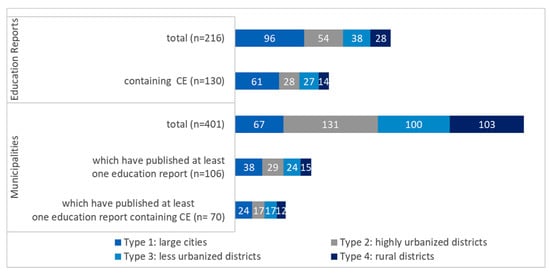 Considering the four types of districts, we found that education reporting was more prevalent in large cities. Whereas more than half of the municipalities of this type (38 of 67, see Figure 1) published at least one report, the share for type 2 and 3 was just under a quarter, and for type 4 only 15%. CE was covered by one third of all districts of type 1 (24 of 67). For all others, the percentages were lower—between 12 and 17%. Looking only at the districts that have published at least one report (n = 106), a contrary picture emerged. Of type 1 and 2, about 60% dealt with CE in their reports (24 of 38 resp. 17 of 29); for type 3, it was just over 70%, and for type 4, it was 80%. Thus, the few reports from rural districts more often included information on CE.