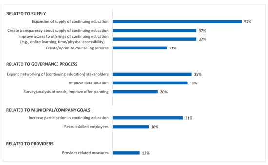 Additionally, the improvement of access to offerings was mentioned frequently. The demand for low-threshold offerings was frequently named. The aim is to remove barriers that make it difficult for people, especially those with a low level of education, to take advantage of the offerings. Accessibility also plays a major role, e.g., for people with limited mobility or disabilities. In addition, the development of innovative digital offerings was also encouraged. This should make it possible to reach people in rural areas through CE that can be used on a flexible basis in terms of time and location. In type 4 districts, it was also pointed out that services should be available close to the residents’ homes, and that access needs to be improved in this way. Mobility is an important criterion for being able to take advantage of offerings. As a result, alternatives in public transport were also suggested, for example pick-up and drop-off services or adapted timetables.