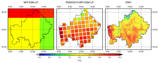 Mean near-surface temperature 1970–1999 in Lower Frankonia. MPI-ESM-LR (left, resolution ca. 180 km), REMO2015 driven by MPI-ESM-LR (middle, ca. 12.5 km), gridded observations of the German Weather Service (right, 1 km) [46].