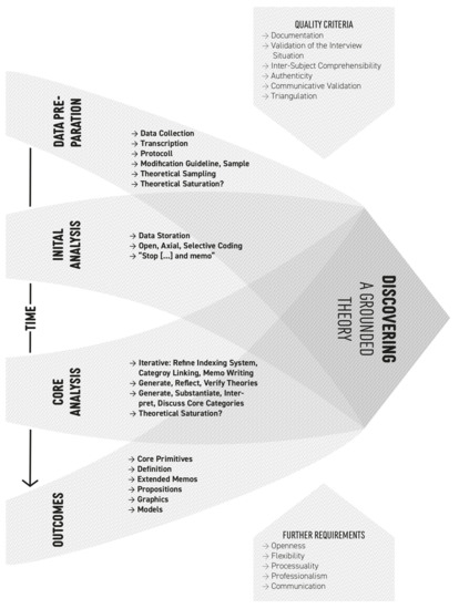 A distinctive element of our approach is the use of the Grounded Theory (GT) methodology according to [53] (see Figure 2), which promises a more intensive and substantial abstraction of theories from empirical data due to its detailed and analytical procedure. The conducting phase is characterized by the fact that it extends into the analyzing phase, where changes and modifications of the guideline, samples, etc., are also made. Thus, writing and analysis take place immediately after an interview is conducted and may influence further sampling (theoretical sampling). Grounded Theory is an approach which makes the researcher sensitive to create an awareness of multiple data meanings to conceptualize and discover theory from them [53]. The characteristic of the iterative process involving open, axial, and selective coding is that these individual steps intertwine, weave the information together, and influence the decisions regarding which data will be collected next. Furthermore, according to [54], theoretical sampling includes circularity of individual steps of analysis, data collection and theorizing. There is an interdependence between the different stages that is similar to the hermeneutic circle and also provides a high level of open-mindedness throughout the research process. The so-called theoretical saturation is reached exactly when no more codes, categories or theories can be derived from the data.
