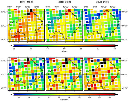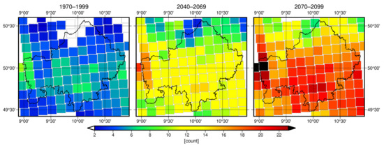 For all temperature-related indices, a clear warming trend is evident until the end of the 21st century. In Figure 3, this is exemplified by the number of hot days (see Table 1). The spatial pattern exhibits the highest number of hit days in the Lower Main region (which is part of the Rhine Rift Valley) and the lowest number in the north-eastern low mountain ranges (Rhön, extensions of Thuringian Forest). The deep valley of the river Main is warmer than its surroundings.