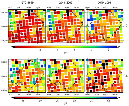 In contrast to temperature, projections for annual precipitation and derived indices do not exhibit clear trends, except for a small increase in annual precipitation sum (regional mean 944.2 mm → 971.4 mm → 978.7 mm) and number of intense rainfall days (24.6 → 26.3 → 26.9) that is visible. Several months, particularly in spring and autumn, are not characterized by coherent trends. In detail, monthly precipitation sums increase in January and December, while they decrease in July and October. Moreover, displayed in Figure 4, the number of heavy rainfall days is projected to rise in January (2.0 (0.2–6.2) → 2.5 (0.3–6.9) → 3.1 (0.4–8.1)) and drop in July (2.7 (1.0–6.1) → 2.5 (0.9–5.3) → 2.1 (0.7–4.9)).