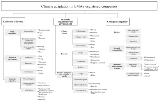 - Change Management: Climate adaptation usually takes place in an implicit manner within climate mitigation measures, partly due to regulations or incentives (e.g., funding for photovoltaic installations or subsidies for the EMAS-certification).