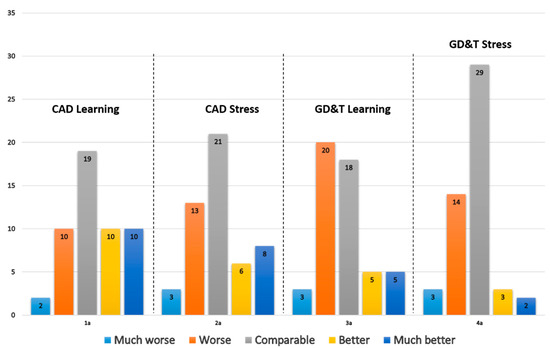 Answers to questions 1b (CAD learning), 2b (CAD stress), 3b (GD&T learning), and 4b (GD&T stress).