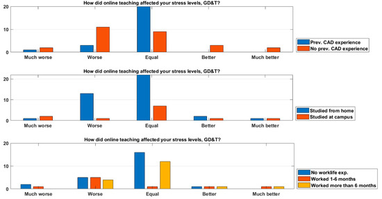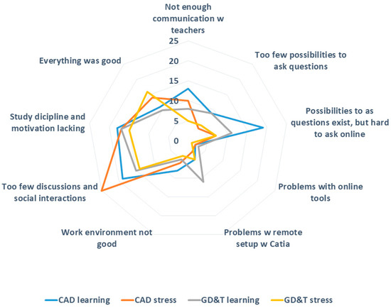 It can be seen from Figure 3 that the students missed the social interactions and discussions. This seems to have been the main cause of stress during the CAD part. It was also one of the main obstacles for learning CAD, together with lack of study discipline and motivation and the fact that students had the possibility to ask questions but found it uncomfortable to do online. For the GD&T part of the course, the learning obstacles were study discipline/motivation and absence of discussions and social interactions. When it comes to stress in the GD&T part of the course, the most popular answer was “everything was good”.