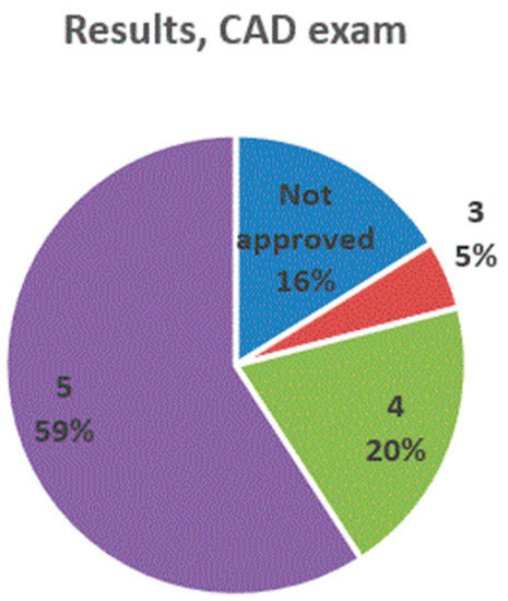 The CAD exam was also held online using Zoom. It was monitored via camera by special personnel and the students could ask questions to the examiner in a special break out room. The results for the exam are shown in Figure 8. The results are quite satisfying with a large portion of approved students. For the approved students, grades from 3 to 5 are given where 5 is the best possible grade. It should be noted that this is a basic course in CAD without any requirement of previous knowledge. A large portion of the students have however had some kind of CAD education during high school. Therefore, the large share of high grades (5) is not very surprising. From a teacher point of view, it was of course easier to answer questions during the exam via the computer compared to visiting a large number of computer rooms.