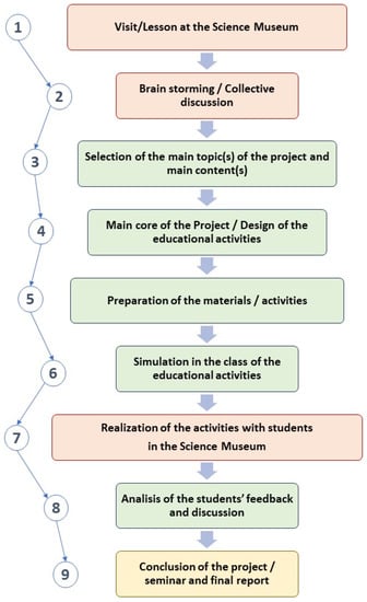 In this paper, a teaching strategy optimized and tested in the last decade to train future chemistry teachers in the frame of a ‘Chemical Education’ course at the University of Pisa [], in Italy, is described. The adopted methodological approach is based on STEAM (STEM with the inclusion of Arts) laboratorial activities [] developed in the context of science museums. Within this approach, undergraduate students and pre-service chemistry teachers attending the course typically follow a project-based learning (PjBL) strategy [] to design structured laboratorial activities to be performed in out-of-school contexts, such as science museums.