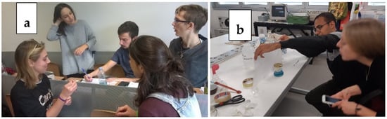 Step 6 is very useful for pre-service chemistry teachers, since they can be more aware about the practical aspects, eventual limitations and problems, and about the timing of the activities. A selection of photos with undergraduate students engaged during steps 4, 5 and 6 in different academic years is reported in Figure 3. During COVID-19 pandemic, most of the activities were performed in remote learning modalities: lessons and cooperative learning activities were performed thought the Moodle platform in distance mode []. In this case, the STEAM project-based learning activities had the aim to produce educational videos and interactive web-pages that were included in the Open-Day program of the Department of Chemistry and Industrial Chemistry during ‘BRIGHT 2020’ [,] and ‘BRIGHT 2021’ [] events. As shown in Figure 3e,f, the preparation of videos showing interactive laboratorial activities and explaining some chemical reactions related to specific topics (‘The Chemistry of Colors’ or ‘The Chemical Gardens’) was performed in a research lab by small groups of students, in compliance with the COVID-19 regulations.