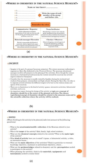 Most of the students who attended the course in the academic year 2018–2019 (21 of 25 students, as reported in Table 1) participated in the visit at the Science Museum ‘MuSNa’ [] in Rosignano Marittimo planned on the 4 October 2018. The visit (step 1) was divided in two parts: the first part (about 30 min) was held in the Auditorium used for pre-service teachers’ scientific animators’ training courses. Here, the students were introduced to non-formal, formal and informal learning and life-long learning. The second part of the visit at the Museum started with an inspiring question: “Where is Chemistry in the Natural Science Museum?” Students were divided in four groups according to the informal cooperative learning method [], introduced to pre-service chemistry teachers in a previous lesson of the course. Additional information was given to each group, explaining the roles of group members according to the cooperative learning strategy, the ‘incipit’ of the activity, showing what each group was expected to do during and after the visit, and some ‘notes’ useful to start planning the activity (see Figure 4).