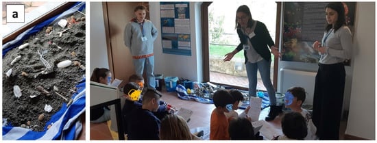 The second actor in Figure 1, namely the ‘Science Museum’, represents a typical non-formal learning context. As discussed in the following, the ‘Science Museum’ has the role to stimulate the creativity process at the basis of the design of the educational activities and laboratories. Since the 2013–2014 academic year, the ‘Science Museum’ was the ‘Museo di Storia Naturale (MuSNa)’ in Rosignano Marittimo (LI) (Tuscany, Italy) []. In the 2019–2020 academic year, thanks to a special project of the University of Pisa [], the ‘Science Museum’ was the ‘Museo Galilei’ in Florence (Italy) []. During the academic year 2020–2021, due to the COVID-19 pandemic restrictions, the non-formal context was a virtual session of remote laboratorial activities designed by the students attending the course of ‘Chemical Education’. These virtual laboratories were presented in occasion of the ‘European Night of Researchers’ in the frame of the ‘BRIGHT’ (“Brilliant Researchers Impact on Growth Health and Trust in research”) project of the Department of Chemistry of the University of Pisa [,]. As detailed in the following, during these last eight years, some of the projects designed by preservice teachers were also carried out at school, during open days at the University of Pisa and in occasion of national science festivals, such as the ‘Festival della Scienza’ in Genova (Italy).