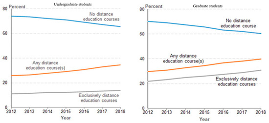 The proportion of (undergraduate and graduate) students who have enrolled or not enrolled in a distance learning course(s) in the USA changed from 2012 to 2018 (Figure 1): The percentage of students who have never taken a distance learning course has been declining, while the percentage of undergraduate and graduate students who have enrolled in at least one distance course has increased to 34.5% and 39.8%, respectively [14].