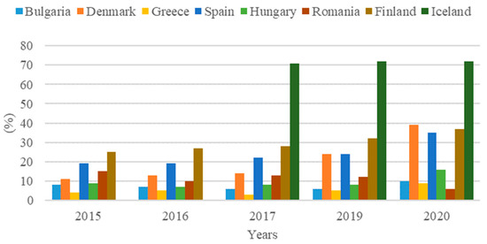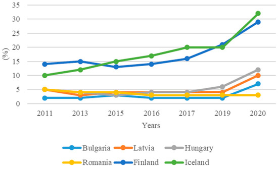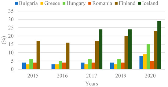 In a few states more than 13% of the population had done an online course, including Finland (21%), Iceland (20%), Sweden (18%), Spain (15%), Estonia (14%), Ireland, and the Netherlands (13%). In contrast, there were states such as Bulgaria (2%), Romania (3%), and Latvia (4%) where the popularity of online courses was very low in 2019 [23]. In 2020, after the start of the pandemic, this proportion jumped, reaching 32% in Iceland, 29% in Finland, and 12% in Hungary, although it remained very low in Romania at only 3%, according to data from Eurostat (Figure 2).