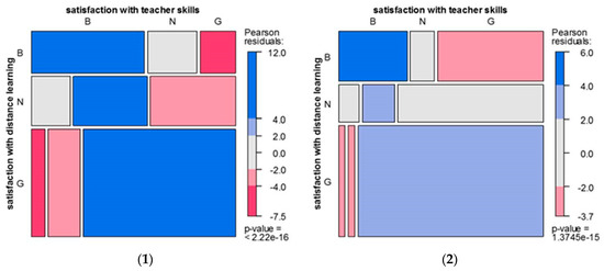 The same trend was observed for Romanian respondents, albeit it was less pronounced. All blocks in the mosaic figure were significant except for the B-N, N-B, and N-G pairings. The largest block was also provided by the number of respondents who were satisfied both with distance learning and the skills of their teachers. Similar to the Hungarian respondents, there were fewer respondents than expected in the opposite groups.