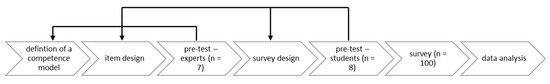 (1) We defined a competence model within which we measured the pre-service teachers’ level for each competency, considering scientific literature and normative frameworks. (2) We designed items following the Delphi study by Hellberg-Rohde and Schrüfer [38] and illustrated the 21 topics from the orientation framework [40] by examples. (3) Experts (geography teachers (n = 4) and professors in geography (education) (n = 3)) validated both the selected competencies and the item testing on it in a qualitative pre-testing. (4) We then designed a survey. (5) The qualitative pre-test with pre-service teachers from different semesters and genders (n = 8) showed that the items were understood as intended; the survey improved its structure. (6) To reach all students enrolled in geography education, the survey was carried out in the winter term of 2018/2019 and summer term of 2019 in all geography education modules at the University of Marburg. (7) All complete surveys (n = 100) were included in the quantitative analysis.