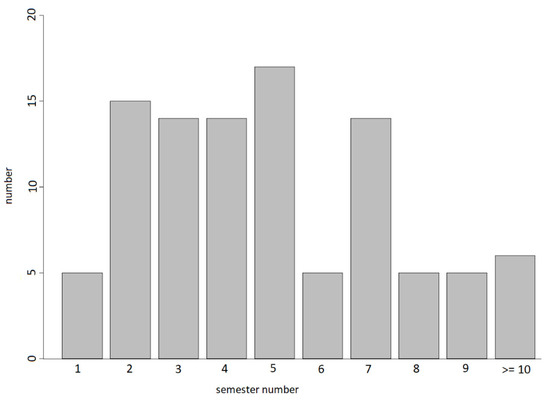 We distributed the survey to all 375 pre-service teachers enrolled in geography at the University of Marburg and included only complete and plausible surveys (n = 100) in the analysis. Our sample represented gender adequately with a slight female bias: 42% of the pre-service geography teachers were female [43] and 46% of the study participants. A total of 58% of the pre-service geography teachers were male [43] and 52% of the study participants. The university statistics only classified male and female students, whereas 2% of the study participants were diverse. Students from all semesters participated in the study (see Figure 3). The teacher education program is designed for nine semesters; thus, those above were summarized. All pre-service geography teachers were enrolled in one or two subjects next to geography because all teachers need at least two subjects in Germany. In the sample, 19% also studied another social science (history, politics and economy, ethics), 24% studied natural sciences (biology, chemistry) or mathematics, 27% studied physical education, and 41% studied a language (German, German as a second language, English, Spanish). Two-thirds of the participating pre-service teachers took geography in their advanced high school education (Oberstufe).