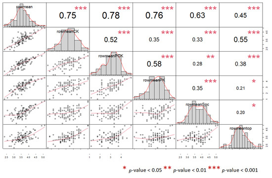 Overall, pre-service geography teachers assessed themselves as having a high ESD competence. The median lay between 3 and 4 for all subscales with the highest results in social and personal competencies (see Figure 4). All subscales correlated with each other (see Figure 5); thus, the pre-service teachers regarded their competence level generally, over the different subscales, as higher or lower compared to their peers. The importance pre-service teachers assigned to the ESD competencies was even higher than their competence level; the median was four or above for all measured subscales (see Figure 6). The pre-service teachers’ interest correlated significantly with their competence (p < 0.05).