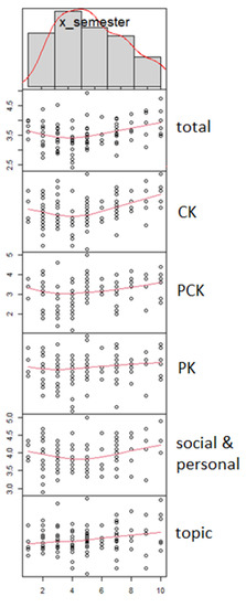There was neither a correlation between the importance and competence nor the semester number and competence level. The school practice correlated by 0.20 (p < 0.05) to the competence. There was no gender effect to the competence assessment, but females significantly assigned higher importance to the PCK (p < 0.01) than males. Pre-service geography teachers expected to develop all five competencies during higher education.