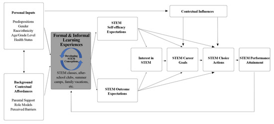 A more recent framework used to understand career choices is Lent and colleagues’ [14] social cognitive career theory (SCCT). According to SCCT, the choices people make and the application of those choices are related to their interests [14]. Lent and colleagues propose that career interests develop over time as individuals process information received through their experiences to develop perceptions about their abilities (self-efficacy), expected results of their actions (outcome expectations), and their career goals. Personal inputs (e.g., gender, race/ethnicity, and age/grade level) and background contextual affordances (e.g., parental support, role models, and perceived barriers) are also believed to influence learning experiences, and can also influence self-efficacy and outcome expectations, both of which form the basis for developing career interests. Within the SCCT framework displayed in Figure 1, conceptions of engineering would be developed based on learning experiences in STEM. Constructivists believe that it is during these learning experiences that individuals build their own conceptions of engineering as they make sense of the work that engineers do. These conceptions can also be influenced by their personal inputs and background environmental influences. For students, these learning experiences include formal school experiences (e.g., STEM classes), structured after-school or summer experiences (e.g., robotics clubs, STEM camps), as well as more informal experiences that occur with family and friends (e.g., family vacations, museums, building projects at home, and observations of parents who are engineers). Thus, while SCCT suggests that interest, self-efficacy, and outcome expectations may drive whether or not a person decides to pursue a STEM career, this decision may also be linked back further to the conceptions that students develop about STEM, which can begin forming at an early age.