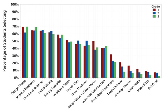 In contrast to the images that all grades perceived similarly, three images (i.e., “design ways to clean water”, “read about inventions”, and “arrange flowers”) were found to be statistically different between grades one and two as well as grades one and three. In these three images a larger percentage of first graders associated the image as engineering, whereas the second and third graders did not. However, only “design ways to clean water” was selected by 50% of the students in the first grade. The other images were selected by less than 50% of the students in all grade levels. This indicates that, although there was disagreement, the majority of students in each grade agreed that the images did not represent engineering. Three images (“teach children”, “make pizza”, and “sell food”) were also found to be statistically different between grades one and three as well as grades two and three, with the largest percentage being first graders associating the image as engineering. However, with the exception of “teach children”, the percentage of students selecting this image was below 10%, indicating that the students typically did not associate this image with engineering. Additionally, it is important to note that the image “design things” was significantly different between grades two and one as well as grades two and three, with more students in the first and third grades selecting this image as engineering.