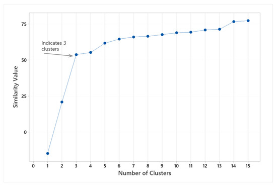 The agglomeration schedule is used to assist in identifying at what point two clusters being combined are considered too different to form a homogeneous group. This is identified by the first large difference in similarity values. Looking at the agglomeration schedule in Table 3, there is a large difference in the similarity values between stages 13 (similarity = 54.8) and 14 (similarity = 20.8). As compared to the other differences between stages, this large difference between stages 13 and 14 (difference = 34) represents a large dissimilarity between clusters. When there is a large difference between the similarities of two consecutive stages, the clusters being merged increase in heterogeneity. This analysis (Table 3) identifies the last stage before dissimilar clusters begin to be merged. That is, the large difference in similarity values between stages 13 and 14 implies that performing stage 14 (that is, moving from three to two clusters) results in dissimilar clusters being merged. Hence, this analysis indicates that the clustering process should be stopped at stage 13, indicating the existence of three clusters. Figure 4 shows a scree plot of the similarity values versus number of clusters, specifically the change in the slope at cluster three, indicating three cluster groups.