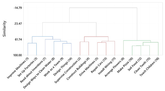 When the images are organized from most selected to least selected by students (Figure 3), they create a continuum from engineering to not engineering. To further determine which images early elementary students similarly perceived as engineering or not engineering individual responses were further analyzed via cluster analysis [35]. The agglomeration schedule (Table 3) displays how the hierarchical cluster analysis progressively clusters the observations. Each row in the table shows a stage at which two cases are combined to form a cluster using an algorithm dictated by the distance and linkage selections. The agglomeration schedule lists all of the stages in which the clusters are combined until there is only one cluster remaining after the last stage. The number of stages in the agglomeration schedule is always one less than the number of cases in the data being clustered. In this case there are 15 stages because there are 16 images (items). The similarity value at each stage represents the distance of the two clusters being combined. As shown in Table 3, images 10 (“Make Pizza”) and 12 (“Sell Food”) are combined at the first stage because the similarity value between them is the smallest out of all the pairs. The difference in similarity values indicates that the clusters being combined at a given stage are more heterogeneous than previous combinations; thus, should be in a different group.