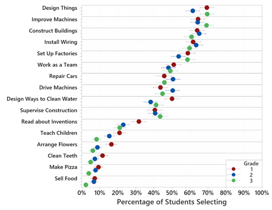 Continuing an exploration of the second research question, Tukey’s multiple comparison test [36] was used to calculate the 95% confidence interval of the percentage of each grade that selected an image as engineering. As shown in Figure 6, the 95% confidence intervals for each image per grade reveal that eight of the sixteen images (i.e., “improve machines”, “construct buildings”, “install wiring”, “set up factories”, “work as a team”, “repair cars”, “drive machines”, and “supervise construction”) were not significantly different by grade.