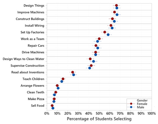 To address the third research question, regarding gendered differences, Tukey’s multiple comparison test [36] was used again to calculate the 95% confidence interval of the percentage of each gender that selected an image as engineering. These data are displayed in Figure 7. Specifically, the graph (Figure 7) reveals that there were no significant differences between the images that male and female students associated with engineering.