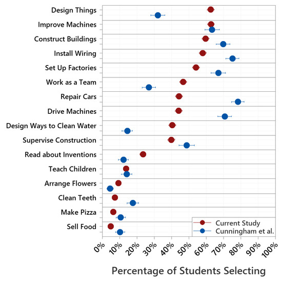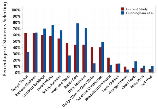 The last research question was to explore how the associations from this sample compared with the associations from the Cunningham et al. [29] study sample, which is the only known study that uses the same survey. The Cunningham et al. study analyzed responses from a random sample of 504 students in grades one–five, which was a slightly larger range of grade levels than our current study. In order to compare the two datasets, the data from the current study were condensed (all of the selections per image for grades one–three) into one result per activity to provide a direct comparison to the work by Cunningham et al. Figure 8 depicts the results from the Cunningham et al. study in blue, with the current study in red. Similarities and differences can be seen across the 16 images.