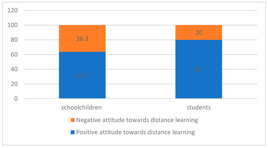Distribution of students and schoolchildren with a negative and positive attitude to distance learning (in %).