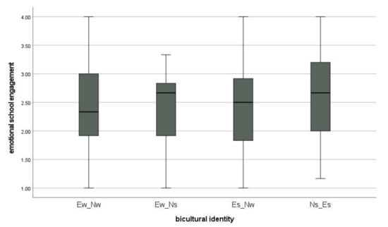 Boxplot of emotional school engagement and bicultural identity: Ew_Nw: weaker ethnic and weaker national identity; Ew_Ns: weaker ethnic and stronger national identity; Es_Nw: stronger ethnic and weaker national identity; Es_Ns: stronger ethnic and stronger national identity.