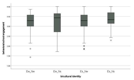 There were no statistically significant differences in behavioral school engagement for the different groups of bicultural identity—F(3380) = 2.12, p = 0.097 (Figure 3).