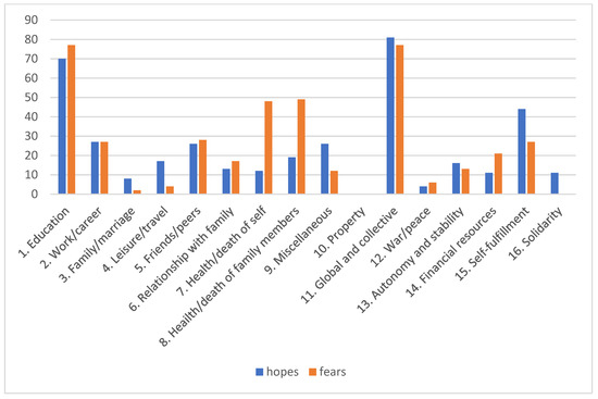 A total of 409 hopes and 396 fears were reported. As presented in Figure 1, the most frequently mentioned hopes and fears were related to global/collective (e.g., hopes (n = 81): “The world will go back to normal”; fears (n = 77; e.g., “We may never get back to the old normal”), followed by education (e.g., hopes (n = 70; e.g., “Achieve positive results at university”; fears (n = 77; e.g., “That I can’t complete my academic goals, not being successful”). After, regarding hopes, the categories most mentioned were self-fulfillment (n = 44; e.g., “Being able to make sense again and define a life project, personal and professional”), work/career (n = 27; e.g., “To work on what I like”), friends/peers (n = 26; e.g., “Get along with my colleagues and friends in a ‘normal’ way”), miscellaneous (n = 26; e.g., “Getting a job that not only allows me to be financially independent, but also makes me feel fulfilled and happy”), health/death of family members (n = 19; e.g., “May my family and friends always be safe and not lack for anything, most importantly, health”), leisure/travel (n = 17; e.g., “Get to know the world and learn from different cultures”), autonomy and stability (n = 16; e.g., “Educate me better about politics so I can vote responsibly”), relationship with family (n = 13; e.g., “Being able to reunite the whole family, without worries”), health/death of self (n= 12; e.g., “Keep me healthy physically and psychologically”), financial resources (n = 11; e.g., “Organize my financial life to become independent”), solidarity (n = 11; e.g., “Getting help and helping others, volunteering”), family/marriage (n = 8; e.g., “Building a family, more specifically, having children”) and war/peace (n = 4; e.g., “To experience freedom again”).