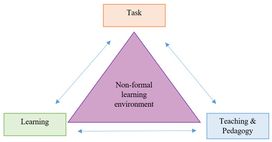 Our four identified themes, which correspond to what participants in this study considered noteworthy of reporting, may form a slightly adapted version of the well-known (in the educational research literature) pedagogical/didactic triangle (see Figure 5). Even though we are aware that some colleagues consider this triangle to be narrow and problematic [59], we believe that this schematic representation of our findings is quite accurate. We are aware there are no clear boundaries between the components of the triangle presented. For example, it is not always easy to talk about learning without referring to teaching as well, and vice versa [60]. Similarly, drawing lines between task design, learning, teaching, and the non-formal learning environment is neither productive nor the purpose here. Yet, we consider these themes important in providing guidelines as to what one could potentially notice when mathematics-learning opportunities are taken outside classrooms, in non-formal settings.