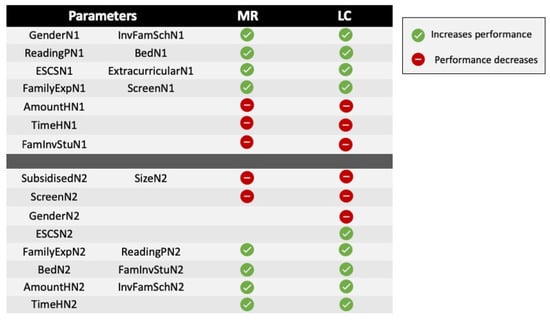 The covariates were added as a fixed part. The results with the significant covariates (99% confidence) for each year are presented in Appendices: Table A1 (MR) and Table A2 (LC). The results must be interpreted while taking into account that the values of the variables are not directly comparable since they have different measurement scales. In some cases, there are standardized scores (ESCS), ordinal scale scores, and in others, for example, dichotomous scores (gender). To find out the type of variable, we recommend referring to Table 1, where the processing is explained, and 6, where the descriptive analyses are presented. Therefore, taking, as a reference, the results of the MR for the year 2016–2017, the expected average results, according to the intercept with no more covariates, for boys of medium ESCS, would be 290.68 with a standard deviation of SD = 23.13. For the female gender, this would correspond to an increase of 3.03 points in the results for the skill. An increase of one point in the ESCS would lead to an increase of 15.32 points in MR, while an increase of one point in the amount of homework would lead to a decrease of 2.57 points in MR. On the other hand, if the center’s average increases by one point regarding bedtime, it would be accompanied by an increase of 13.09 points in MR, or if the center’s average in commitment to reading increases by one point, it would be accompanied by an increase of 6.02 points in MR.