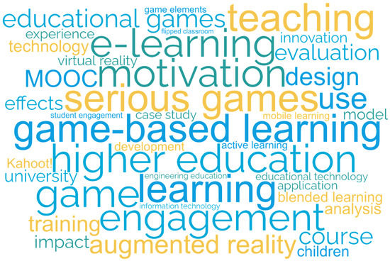 In order to provide an overview of the topics appearing in educational gamification research, a word cloud has been drawn based on the list of the most frequent keywords. The WordClouds.com tool has been used for this purpose [64]. The resulting word cloud is shown in Figure 2.