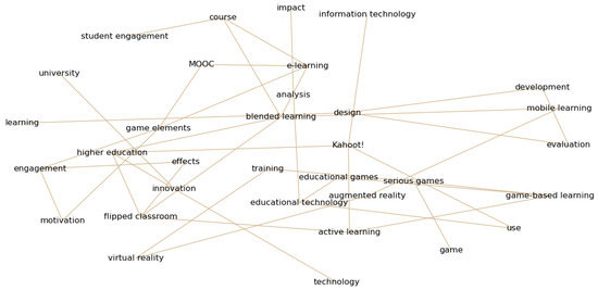 Figure 3 presents 40 pairs of keywords with the highest measured value for the Pearson correlation coefficient (the beige line between two keywords indicates such a pair). While most of these pairs consist of two obviously-related concepts (e.g., “educational games” and “educational technology”, “engagement” and “motivation”, “augmented reality” and “virtual reality”, “active learning” and “flipped classroom”, “innovation” and “technology”, or “game” and “serious games”), some connections bring some new insights, as is stated in the following.