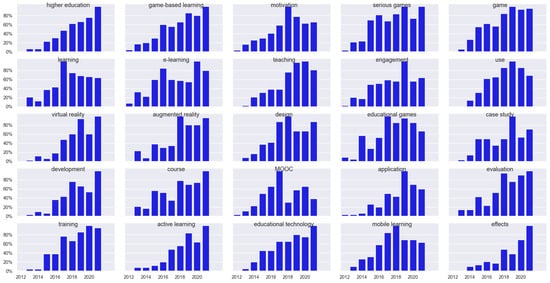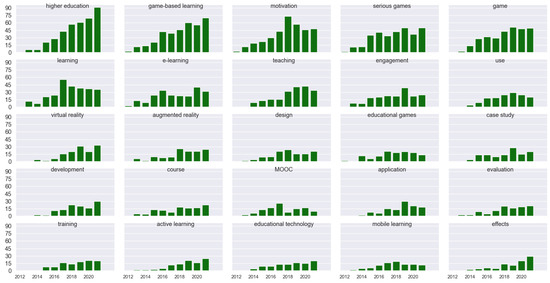 Throughout the entire analyzed period, the top 10 keywords were as follows: “higher education” (used 383 times), “game-based learning” (363), “motivation” (353), “serious games” (314), “game” (298), “learning” (273), “e-learning” (224), “teaching” (204), “engagement” (186), and “use” (149). These 10 keywords together were used 2747 times, which constitutes about 10% of all counted uses. The top 25 keywords (covered in Section 3.5) were used 4393 times, which constitutes about 16% of all counted uses. Table 1 lists the 5 most frequent keywords for each year covered in the analysis.