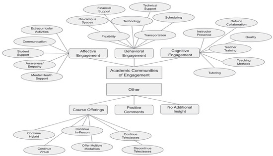Regarding cognitive engagement, participants’ most prominent need was teaching methods specific to online and blended learning, as well as instructors who are better trained in online and blended learning modalities to teach these classes. We know from online and blended learning research that proper teaching methods and techniques are critical for the success of this type of learning. Improving the quality of online and blended courses and ensuring instructors are properly trained to teach these types of classes could significantly influence the ability of students to engage cognitively with the material [33,49]. Last, participants’ suggestion for courses to return face-to-face most likely supports the previous findings that there is not currently adequate support for these types of classes. While there may be specific courses better suited for the traditional face-to-face teaching model, implementing the proper support at the institutional level for online and blended courses could mitigate many of the issues and barriers students are experiencing in these classes.