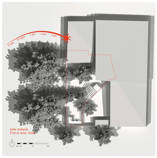 Each group performed a solar analysis of their intervention and control sites. Most teams conducted their solar analyses using Rhino software with the plans of their site, and topographical/height information sourced from VanMap and Google Earth. Students were asked to select 21 June 2022, reflecting Spring Equinox, and model the sun at 11 am, 12 noon, 1 pm, 2 pm, 3 pm; and analyze the modeled sun patterns in the main playing areas of the play space (Figure 3). The following metrics were developed by Corcoran and Herrington to assist students with decisions around shading interventions.