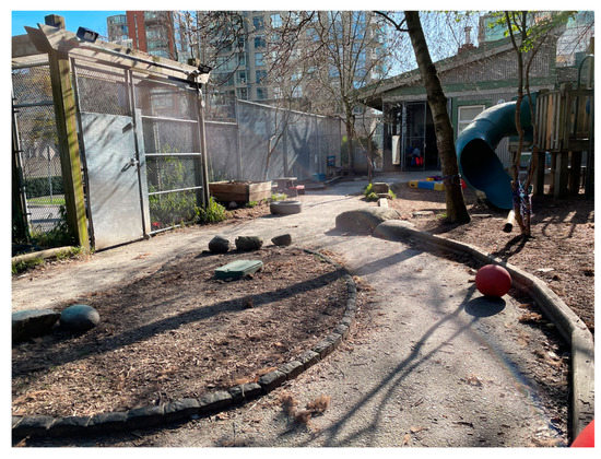 Little Bunny received the second highest pre-intervention Seven Cs score with 94 out of 135. It was the largest of the four interventions sites with a series of looping paths which afforded ample room to play and run (Figure 4). As such, it received the highest pre-intervention score, 12, for Connectivity. A low wooden fence between the Little Bunny play space and the outdoor play space for the toddlers created opportunities for dialogue across the fence between children and the ECE. This is reflected in the score of 19 (tied for highest with Crawley Cubby) for Context. Unfortunately, many plants were dead.