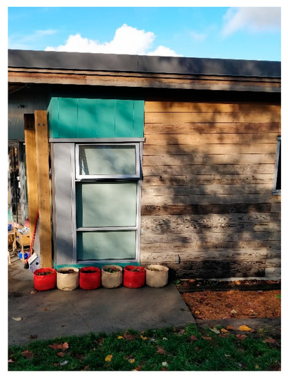 Students also installed grow bags, soft canvas planters, at the base of the building where children hit the structure with their sleds. This solution offered the thrill of careening a sled into a wall, while providing a cushioned impact to avoid serious injuries. During the non-winter months, the planters provided a planting area for the ECE and children (Figure 18). The Little Bunny team also brought the children rough, unsanded stumps for play. The licensing officers discussed with the students how rough stumps could potentially cause slivers, but they approved this material as natural loose parts with acceptable risks.