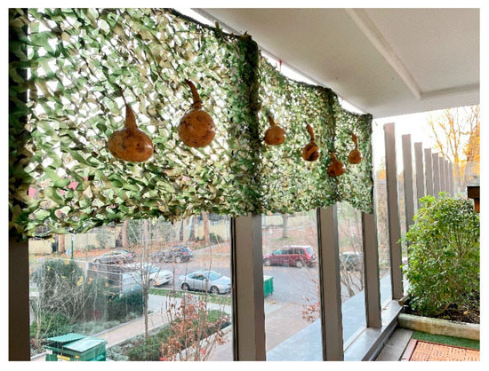 Little Bunny. The Little Bunny site combined pre-fabricated and hand-crafted design components. The site’s area of intense sun exposure was outfitted with a custom shade sail. The group added apertures to create dappled light by burning holes into the shade sail with a heated metal implement they designed themselves (Figure 12). A play shade element in this area involved the installation of trail marker tape over a rigid wire mesh that the students secured over the existing arbour structure (Figure 13).
